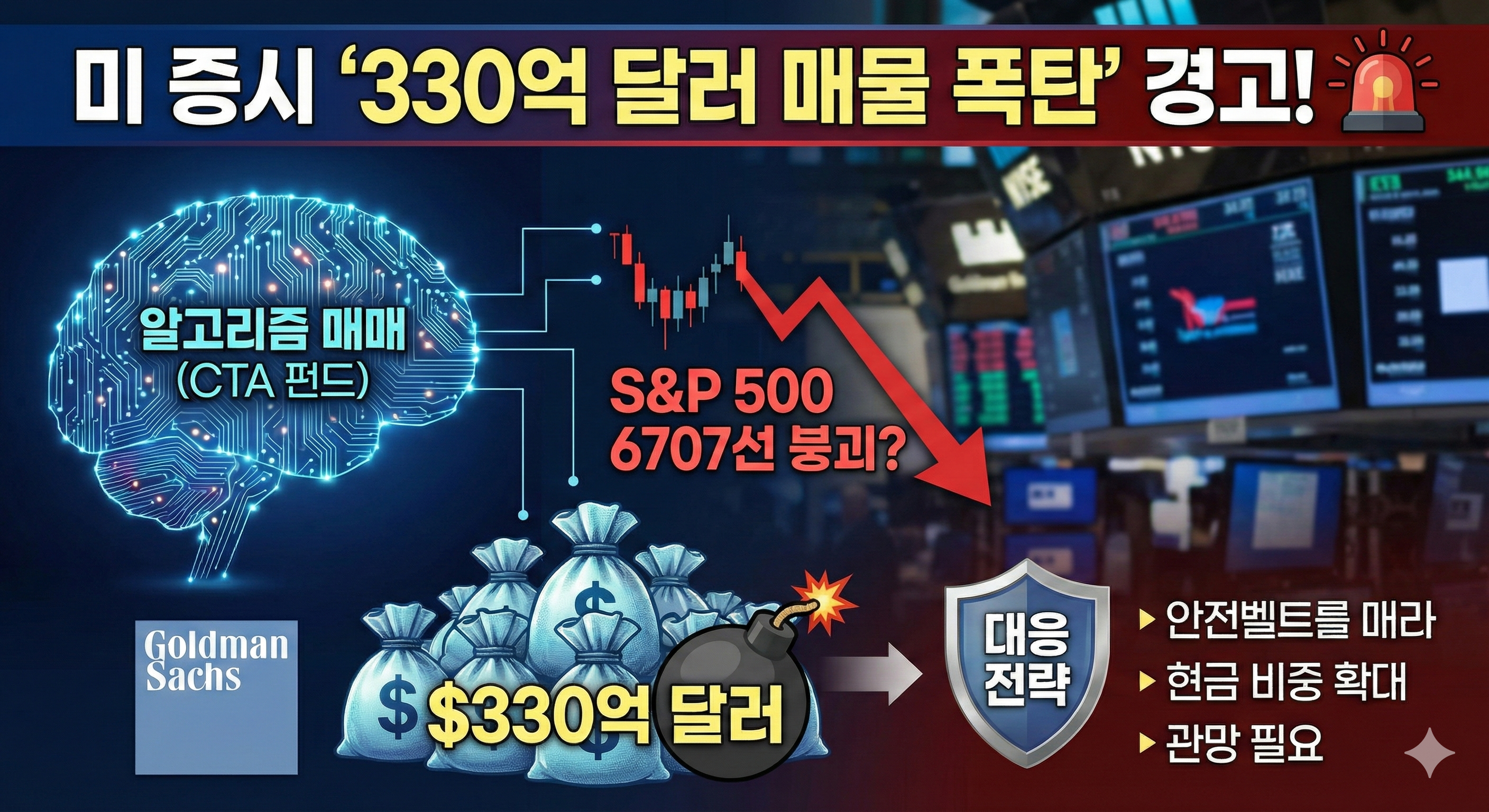 이번 주 미국 증시에는 사람이 아닌 '기계'가 던지는 330억 달러(약 48조 원) 규모의 매물 폭탄이 대기하고 있습니다. 시장이 올라도, 횡보해도, 내려가도 매도 버튼을 누르도록 설계된 알고리즘 펀드들이 시장을 압박하고 있기 때문입니다.