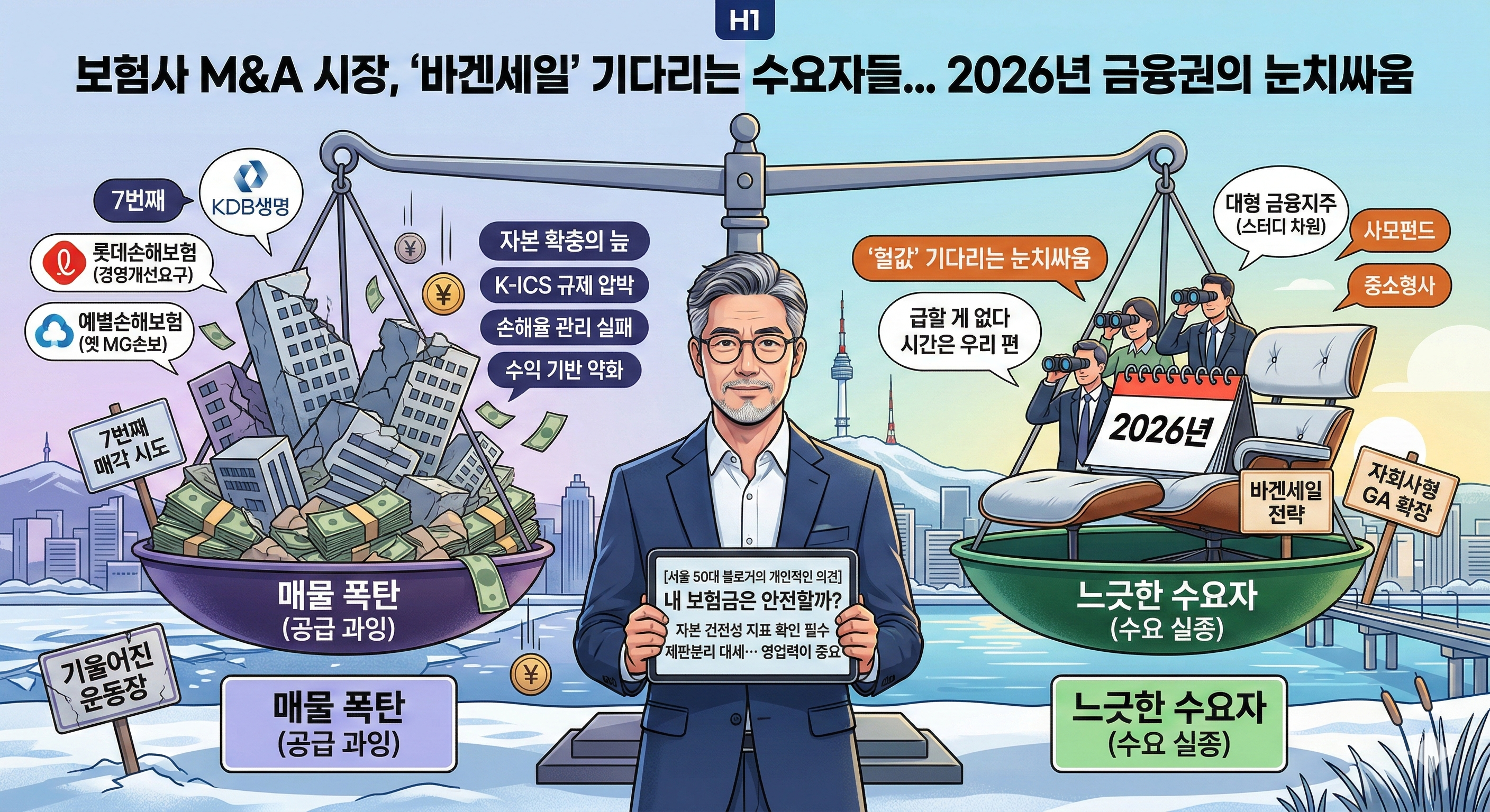 2026년 대한민국 보험업계의 인수·합병(M&A) 시장은 그 어느 때보다 차갑습니다. 시장에는 KDB생명, 롯데손해보험, 그리고 예별손해보험(옛 MG손해보험) 등 굵직한 매물들이 줄지어 나와 있지만, 이를 사려는 원매자(수요자)들의 반응은 미적지근하기만 합니다.