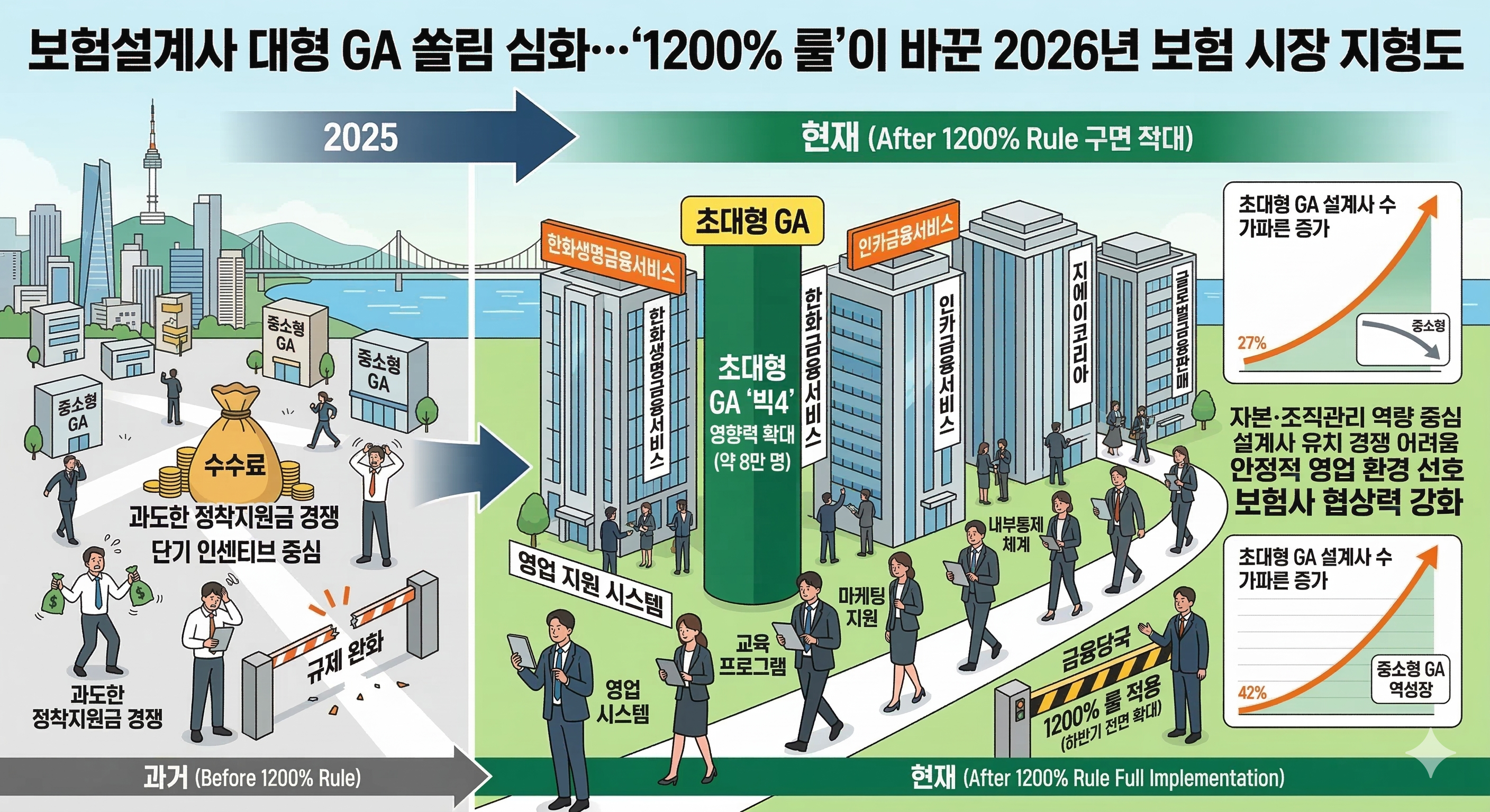 오는 7월부터 GA 업계에도 전면 적용되는 '1200% 룰'은 이러한 흐름을 가속화하는 기폭제가 되고 있습니다. 단순히 수수료를 많이 주는 곳을 쫓던 시대에서, 이제는 시스템과 자본력을 갖춘 조직으로 모여드는 '안정 지향형' 이동이 대세가 된 것입니다. 오늘은 2026년 3월 기준, 대형 GA 시장의 현황과 급격한 쏠림 현상의 배경을 심층적으로 분석해 보겠습니다.