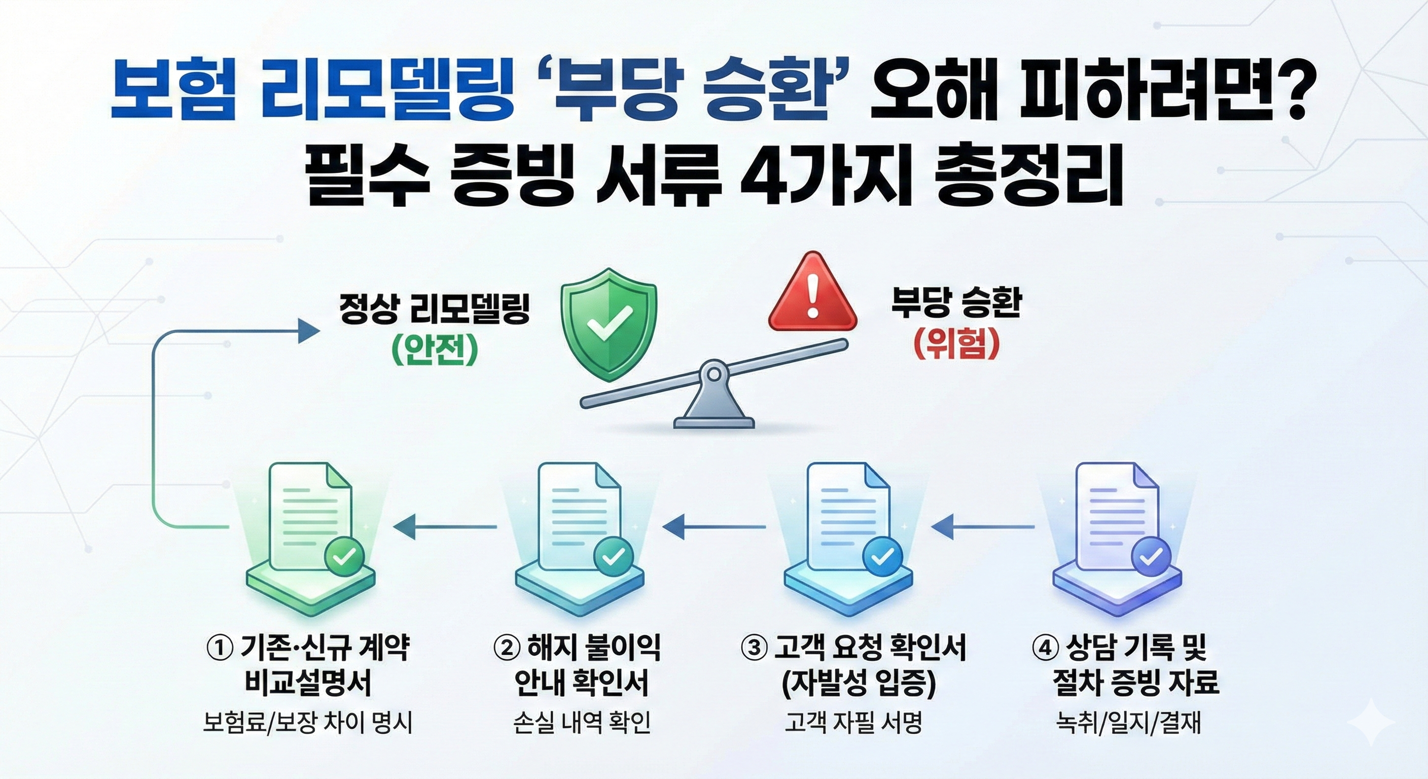 보험 리모델링은 고객의 노후와 안전을 지키는 숭고한 업무입니다. 하지만 2026년의 강화된 규제 환경 속에서 '증빙 없는 진심'은 법적 처벌의 대상이 될 뿐입니다. 오늘 소개해 드린 4가지 서류를 철저히 준비하여, 정당한 영업 활동을 보호하고 고객의 소중한 자산도 지켜내시길 바랍니다.