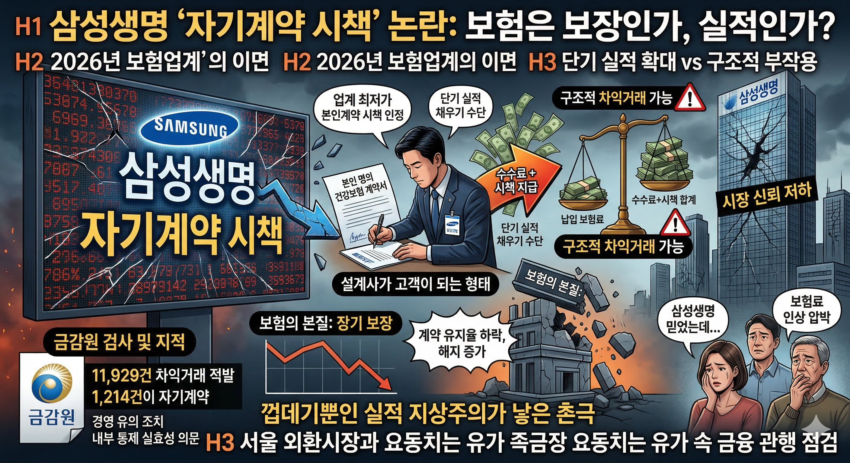 2026년 3월, 대한민국 보험업계의 맏형 격인 삼성생명이 예기치 못한 논란에 휩싸였습니다. 바로 설계사가 본인 명의로 보험에 가입할 때 수수료와 추가 수당(시책)을 얹어주는 이른바 ‘자기계약 시책’ 마케팅 때문입니다. 보험의 본질인 '보장'보다 '단기 실적'에 치중했다는 비판이 거세지고 있는 가운데, 이번 사태의 내막과 그 위험성을 짚어보고 서울에 거주하는 50대 블로거의 시선에서 본 솔직한 생각을 정리해 보겠습니다.
