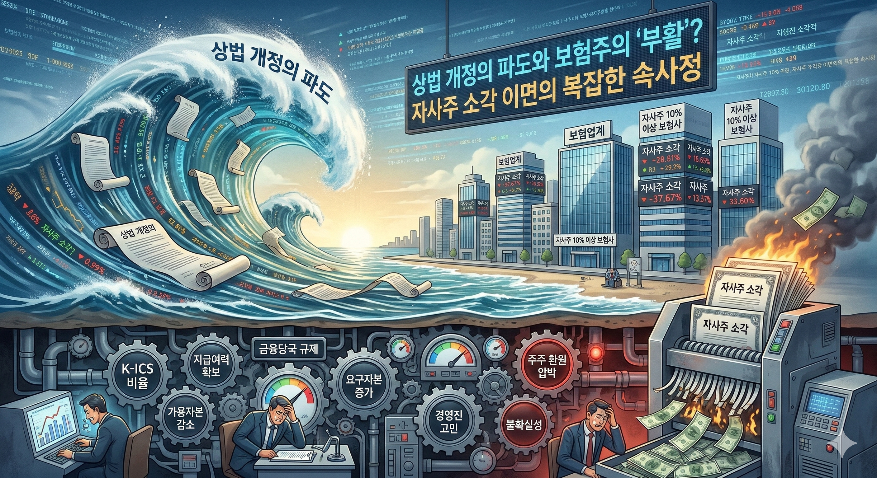2026년 대한민국 증시의 가장 뜨거운 감자는 단연 '상법 개정'과 그에 따른 '자사주 소각'입니다. 오랫동안 한국 증시의 고질병으로 지적되어 온 '코리아 디스카운트'를 해소하기 위한 강력한 법적 장치가 마련되면서, 특히 자사주 보유 비중이 높았던 보험업계가 격랑 속으로 빠져들고 있습니다. 오늘은 3차 상법 개정안 통과 이후 보험사들의 행보와 그들이 마주한 현실적인 고민들을 심층적으로 분석해 보겠습니다.