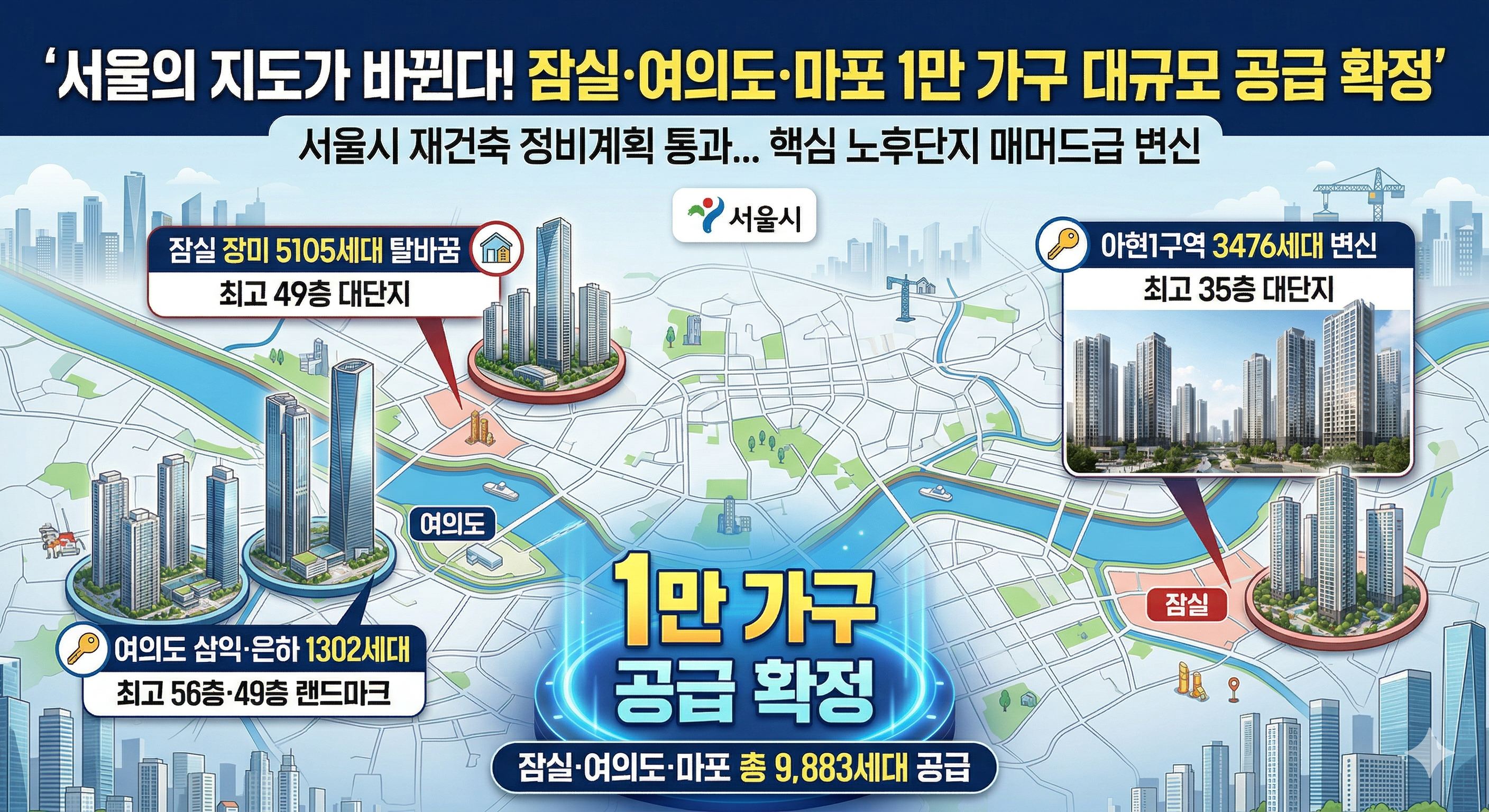 2026년 3월, 서울 부동산 시장에 활기를 불어넣을 대규모 공급 소식이 전해졌습니다. 서울시 도시계획위원회 심의를 통해 잠실, 여의도, 마포 등 서울의 핵심 입지에 약 1만 세대에 달하는 새 아파트 공급 계획이 통과된 것입니다.