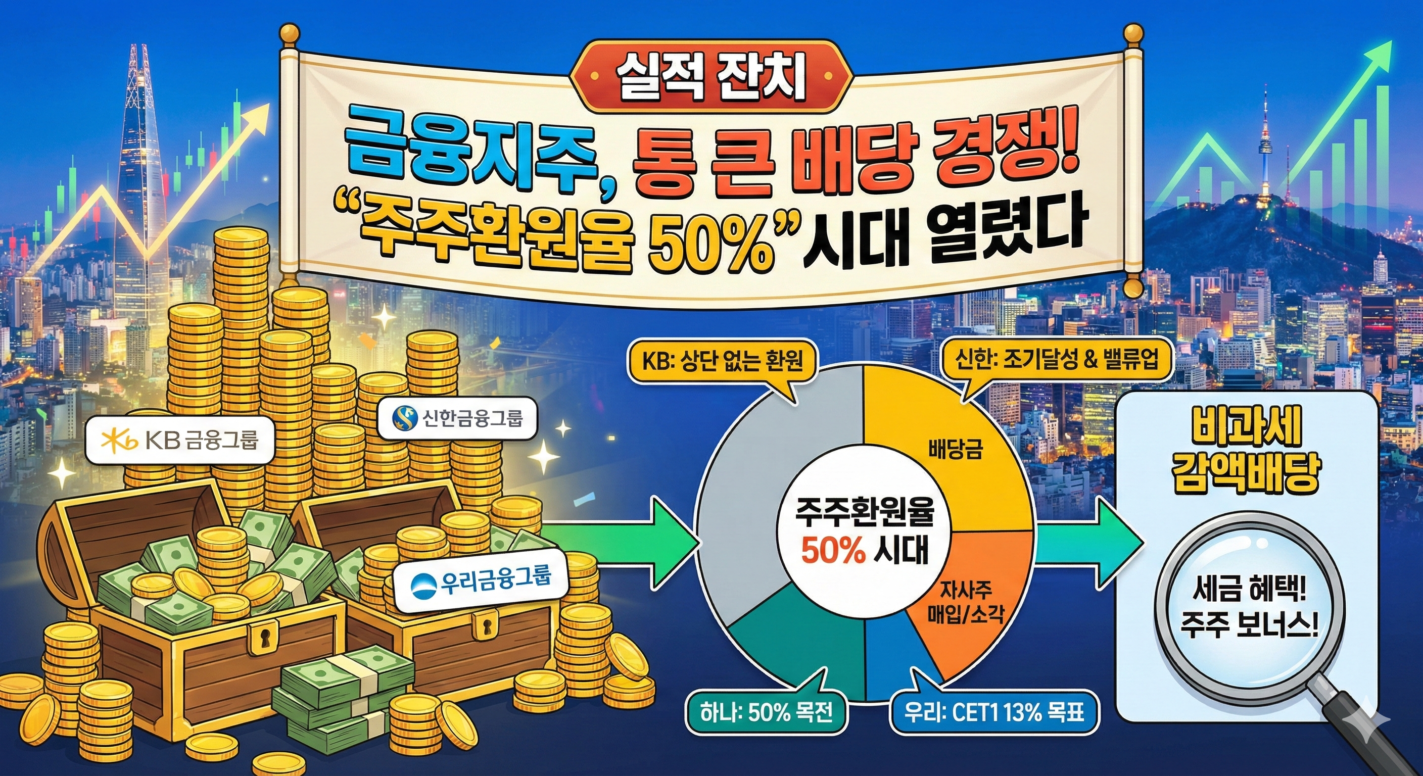 실적 잔치 금융지주, 통 큰 배당 경쟁! '주주환원율 50%' 시대 열렸다