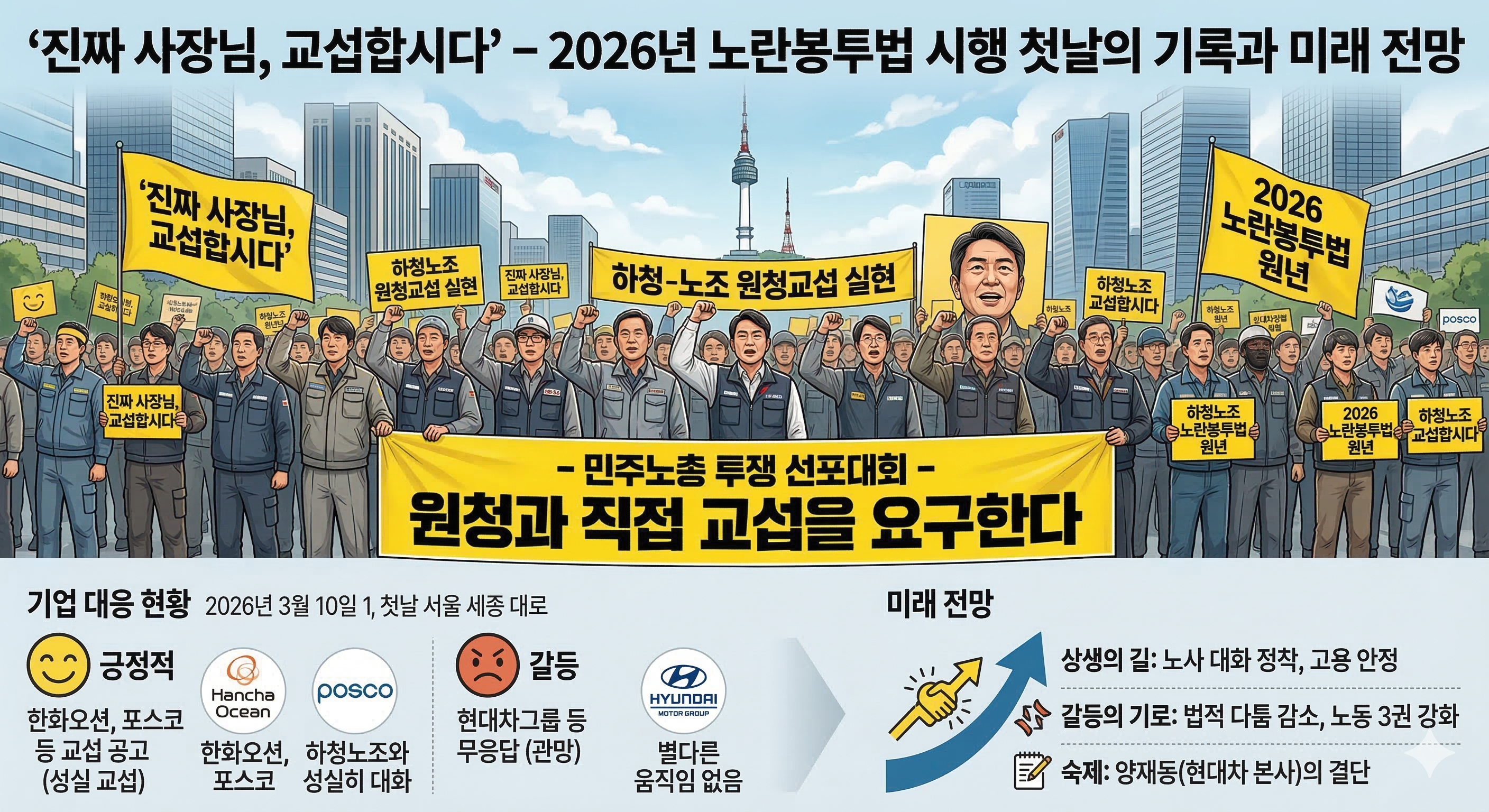 2026년 3월 10일, 대한민국 노동 현장에는 그 어느 때보다 뜨거운 열기가 가득했습니다. 이른바 '노란봉투법'이라 불리는 개정 노동조합 및 노동관계조정법이 본격적으로 시행된 첫날이었기 때문입니다. 그동안 "우리의 진짜 사장은 누구인가"라고 물어왔던 하청, 간접고용, 플랫폼 노동자들이 이제는 법적 근거를 가지고 원청 기업을 향해 직접 교섭의 손길을 내밀기 시작했습니다.
