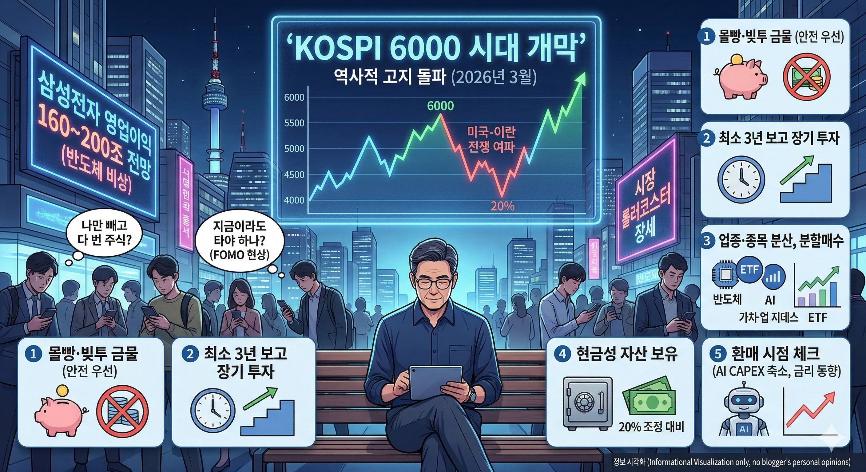 솔직히 말씀드리면, 코스피 6,000이라는 숫자가 반가우면서도 무섭습니다. 삼성전자가 200조를 번다는 소식에 가슴이 뛰다가도, 점심시간 광화문 식당가에서 너도나도 주식 창만 들여다보는 모습을 보면 '이거 좀 과열 아닌가' 하는 서늘한 걱정이 앞섭니다.