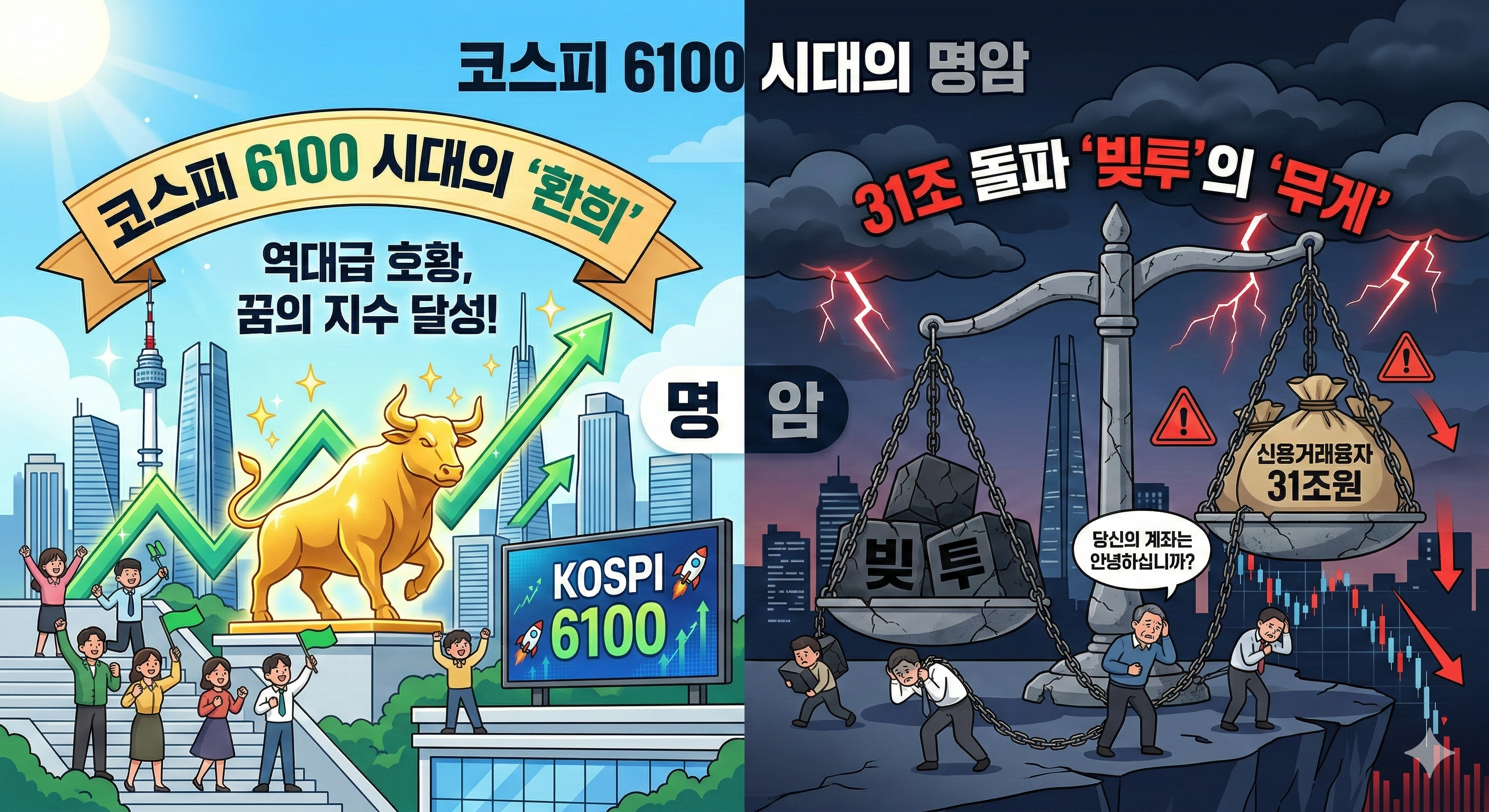 하지만 여러분, 냉정해집시다. 지금의 코스피 6100은 우리가 만든 것이기도 하지만, 글로벌 AI 열풍과 정부의 부양책이 만든 거대한 파도이기도 합니다. 파도는 밀려올 때보다 빠져나갈 때 훨씬 더 무섭습니다. 서울의 화려한 야경을 보며 "나만 거지 되겠다"는 불안함에 휩싸여 빚을 내는 순간, 여러분은 시장의 '먹잇감'이 될 확률이 높습니다.