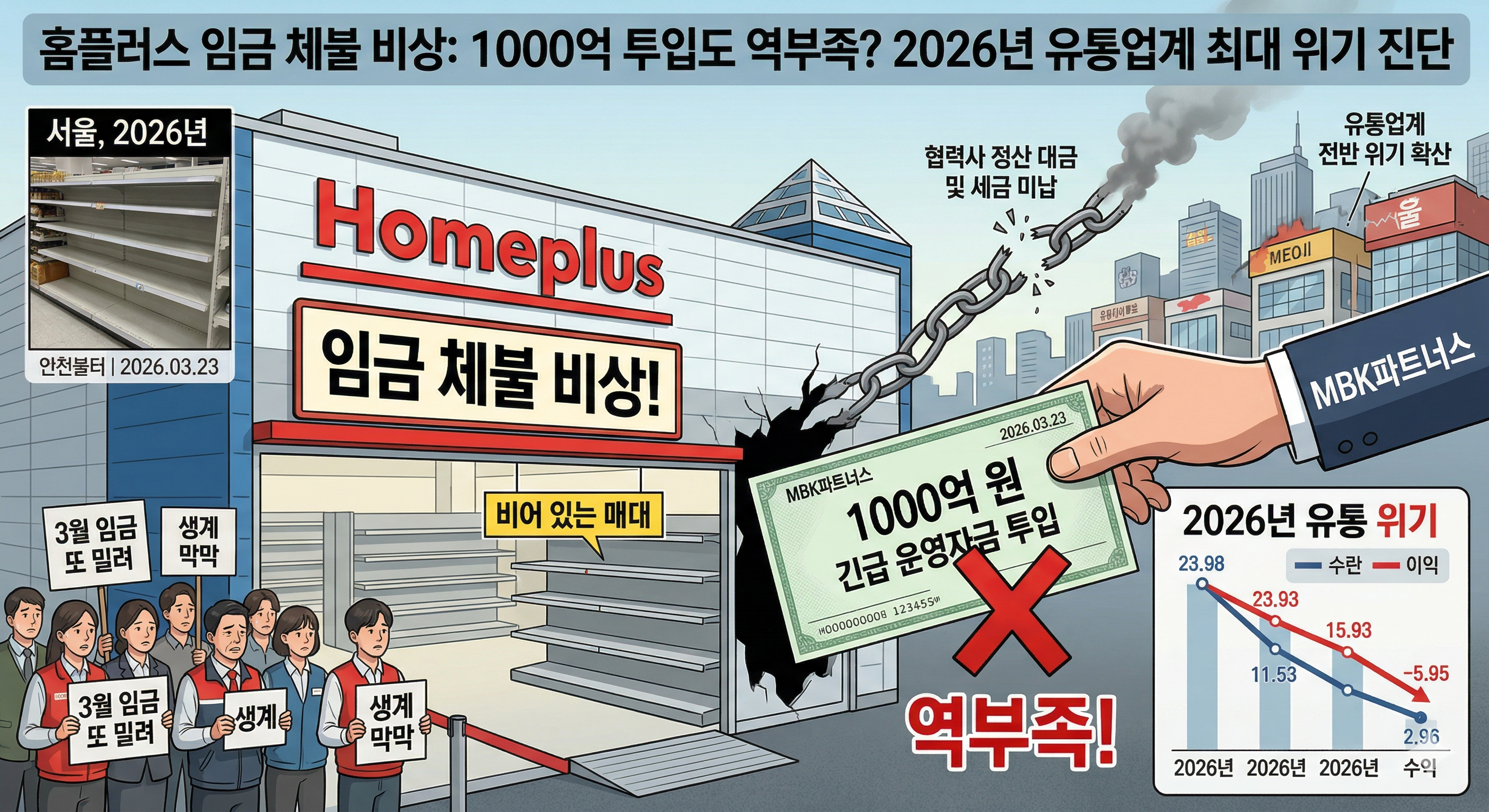 2026년 대한민국 유통업계에 충격적인 소식이 전해졌습니다. 한때 대형마트 업계의 강자로 군림하던 홈플러스가 기업회생절차(법정관리) 속에서 또다시 임금 체불 사태를 맞이했습니다. 대주주인 MBK파트너스가 사재까지 출연하며 1,000억 원의 긴급 자금을 투입했음에도 불구하고, 눈덩이처럼 불어난 미지급금을 해결하기엔 역부족이었습니다. 직원들의 생계는 물론, 협력사 정산 대금 미납으로 인한 매대 공백 현상까지 발생하며 홈플러스의 존립 자체가 위태로운 상황입니다. 오늘은 홈플러스의 현재 자금난 상황과 향후 매각 전망에 대해 심층적으로 살펴보겠습니다.