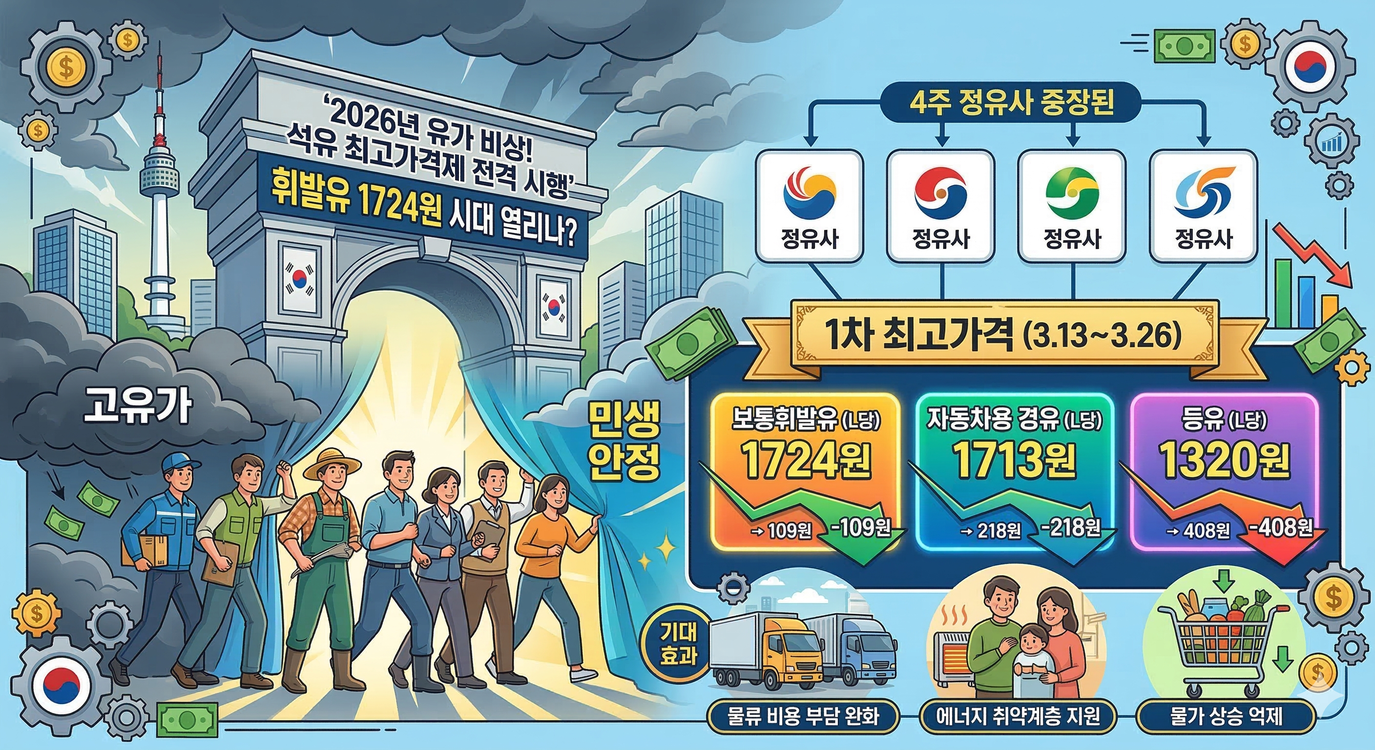 2026년 3월 13일, 석유 최고가격제의 시행은 국제 유가 폭등이라는 파도를 넘기 위한 긴급 처방전입니다. 휘발유 1,724원, 경유 1,713원이라는 숫자가 상징하는 것은 단순한 가격이 아니라 '민생 안정'에 대한 정부의 절박함일 것입니다.