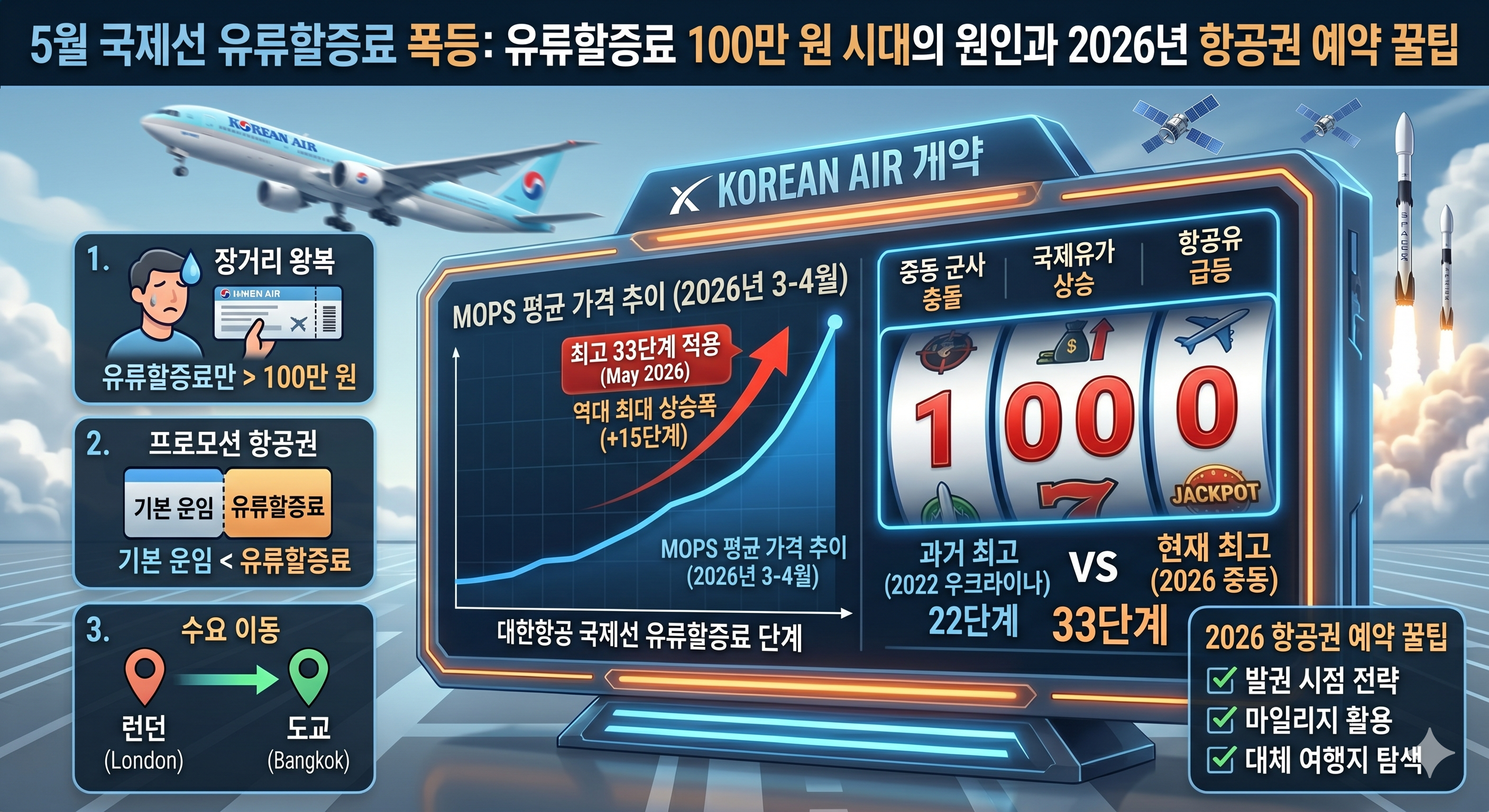 2026년 5월, 황금연휴를 앞두고 해외여행을 계획하시던 분들에게 날벼락 같은 소식이 전해졌습니다. 국제 유가 급등의 여파로 국제선 유류할증료가 역대 최대 수준으로 치솟으면서, 이제는 배보다 배꼽이 더 큰 상황이 현실화되고 있습니다. 특히 장거리 노선의 경우 유류할증료만으로 왕복 100만 원을 넘게 지불해야 하는 유례없는 '비행깃값 공포'가 시작되었습니다.