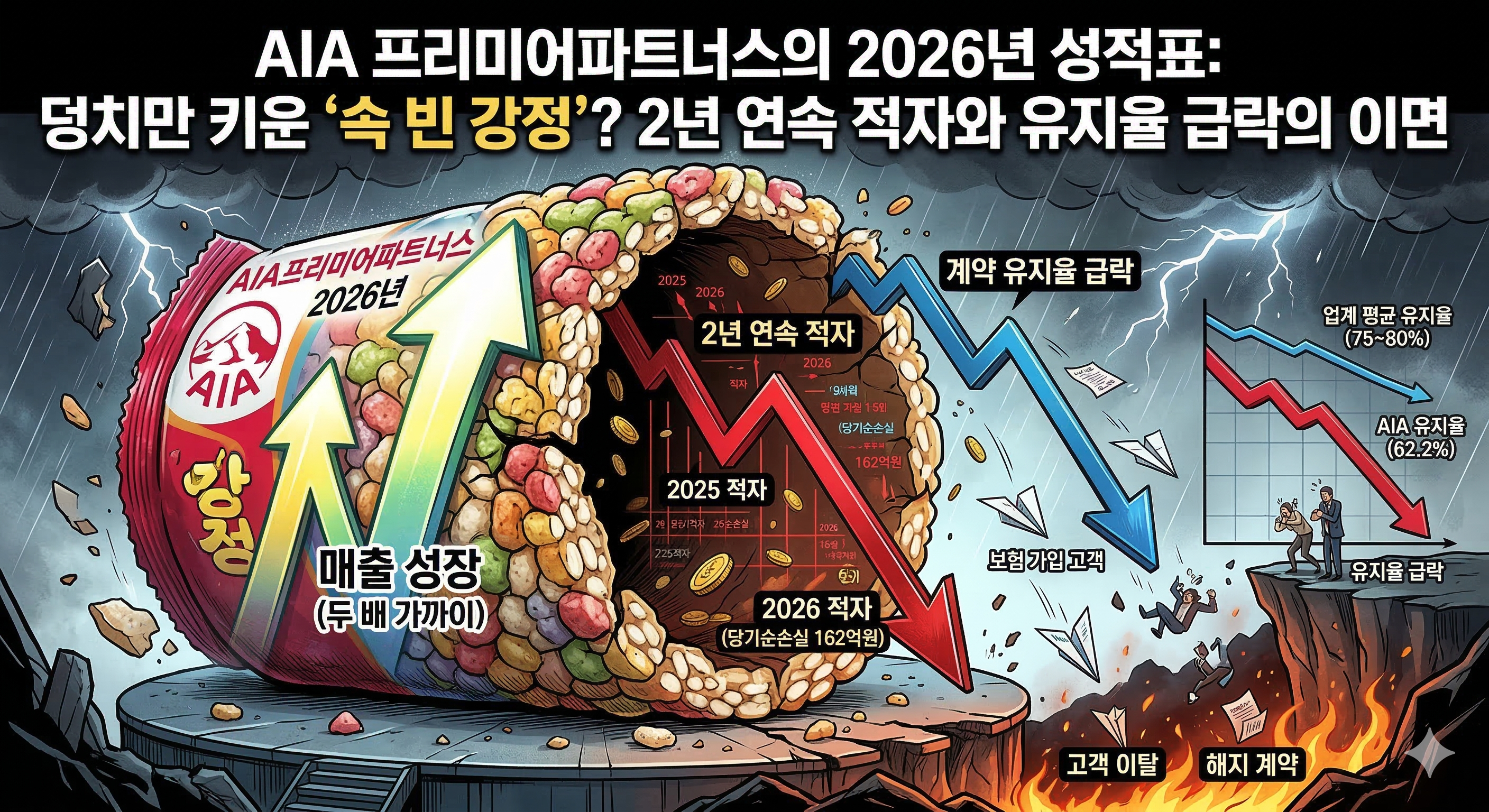 2026년 보험 업계의 경쟁이 갈수록 치열해지는 가운데, AIA생명의 전속 법인보험대리점(GA)인 AIA프리미어파트너스가 위태로운 성장 가도를 달리고 있습니다. 외형적으로는 매출이 두 배 가까이 뛰며 ‘폭풍 성장’하는 듯 보이지만, 그 내실을 들여다보면 적자의 늪과 고객 이탈이라는 심각한 경고등이 켜진 상태입니다. 오늘은 2026년 최신 공시 자료를 바탕으로 AIA프리미어파트너스의 현재와 미래 과제를 정밀 분석해 보겠습니다.